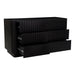 The Povera 6-drawer dresser balances detail and form offering bold statement appeal and ample storage. This piece anchors the bedroom with its Acacia façade's gentle ribbing reminiscent of ripples and waves, adding texture and warmth. A rich black finish with a soft purple undertone allows the natural wood grain to show through. Naturally beautiful with an impactful silhouette, six soft close drawers open with side mount ball bearing glides.