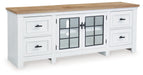 Casual style with substance. This two-tone TV stand raises the bar on comfortably cozy design. A sturdy silhouette with a butcher block oak veneer top, classic white finish and contemporary black metal hardware exudes modern farmhouse vibes. The spacious cabinet, display shelves and drawers let you tuck away entertainment essentials while displaying treasures in this charmingly curated piece. Cutouts for wire management help keep the look relaxed and uncluttered.