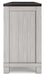 - Glazed light gray painted finish with brown cherry-stained shelves and top