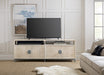 A sleek form is complemented by a soft and soothing whitewash wood finish, accented by a gray metal base and textured oval hardware on the Door Entertainment Console. Crafted of Mango Solids and iron, there’s one shelf behind each pair of doors and two open storage areas. Accommodates an 80-inch flat screen TV.