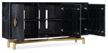 Sleek style and a classic black and gold color scheme come together to create a stunning piece in this 69in entertainment console. Crafted of Mango Wood with a gold-finished iron base, it features a rustic black finish accented by generously scaled oval-shaped, hammered gold metal hardware. There’s one removable shelf behind each doors and a ventilated back panel. Accommodates up to a 70-inch TV.
