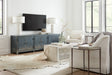 Inspired by the Belgian design aesthetic, the Salvator Media Console is alluring in its simple sophistication. The finish is a heavily distressed aged blue with dry brushing and rub-through with matching blue painted hardware. There are six doors with one adjustable wood shelf behind each pair of doors, and a three-plug outlet and ventilated back panel. Accommodates up to an 80-inch TV.