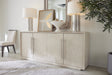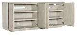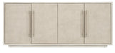 Sleek and stunning with a timeless sophistication and soft modern aesthetic, the Modern Mood Entertainment Console combines Quartered Oak Veneers with raffia-wrapped doors, warm pewter brushed metal bar pulls and leather accents. The Diamond Finish has crystal-like alabaster and pewter hues, offering a serene style. Features include four doors with soft-close hinges and magnetic catches, two adjustable wood shelves behind each pair of doors, ventilated back panels and wire management holes in the back panel and a three-plug electrical outlet behind the right-side doors.