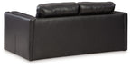 Keen on crisp, contemporary design? Adore the pleasure of leather? Look no further. This loveseat satisfies on every level. Richly textured and decadently supple, the cushion is wrapped with expertly matched leather and faux leather upholstery in an on-trend onyx tone. Sleek double-padded arms and a low, clean-lined profile complete the spacious loveseat's simply chic appeal.