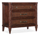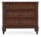 Taking inspiration from the tropical craftsmanship of botanical carving and woven cane accents of classic British and Dutch Colonial design, the Charleston Nightstand is crafted of Cherry and Walnut Veneers, Walnut Inlay and Cane with a Solid Wood top. All 3 self-closing drawers have cane insets, and the two front posts are adorned with botanical carving. There are two USB ports and chargers on the back, along with a cord clip. The nightstand is finished in Maraschino Cherry using natural grain Cherry Veneers showcasing a dramatic cathedral structure with naturally occurring knots to deliver a rich warm finish and a smooth sophisticated aesthetic. The round knob and bar pull hardware has an antique bronze finish.