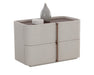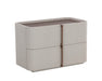 This contemporary large nightstand is defined by its beautiful and gentle curves. Upholstered in cream faux leather with a brown oak veneer tabletop that is sure to impress. Includes two drawers and completed with a rustic bronze steel base. Coordinating dresser also available, along with a smaller nightstand version. Handle With Care: This design has been crafted with faux leather. Faux leather is manufactured to reflect the natural characteristics of leather; as such, colour variations, markings wrinkles, grooves, and light scratches are appreciated characteristics. No two pieces will be alike. Visit our Product Care page for more information on how to ensure the lasting beauty of this piece.
