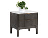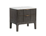 A sculpted two drawer nightstand with a sleek modern appeal. Features a white marble top paired with a sturdy acacia wood base in a brushed grey finish. Completed with brushed metal handles. Anti tipping kit included. Pairs well with the Keldon nightstand. As marble is a natural material, unique veining, pitting, fissures, micro-cracks and colour variations are all characteristics that add to the uniqueness and beauty of each piece.