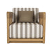 The Adelaide outdoor accent chair infuses the outdoor space with vintage-inspired charm. This contemporary accent chair features a solid teak frame and quick-dry foam cushions upholstered in 100% Olefin fabric. The brown and white striped cushions, accented with a solid tone toss pillow, create visual interest without overwhelming. The curved windowpane detailing nods to vintage designs while maintaining a modern aesthetic.