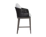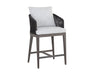 Blur the lines of inside and out with this beautiful outdoor counter stool. This comfortable design features a barrelback frame wrapped in dark greymix weave and seat cushions in gracebay grey fabric. A natural teak wood base completes the look. Teak wood will develop a silver-grey finish over time.