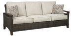 Pretty enough for trendy interiors, yet durable enough to weather the elements, the Paradise Trail outdoor sofa rises to the challenge beautifully. Handwoven resin wicker over rust-proof aluminum merges high style with low maintenance. Rest assured, though the exposed armrests and feet look remarkably like wood, their sturdy aluminum construction is perfectly suited for alfresco living. Plush seat cushions and throw pillows wrapped in high-performing Nuvella® fabric aim to please.