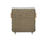 Escape to an outdoor oasis with this beautiful Outdoor by SUNPAN armchair crafted with a unique set of mixed materials. Features deep, thick seat in palazzo cream fabric with sleek, solid teak wood armrests. A taupe wicker exterior complete this intricate design. Teak wood will develop a silver-grey finish over time. Teak wood has a high oil content that enables its outdoor resistant properties. These natural oils may surface and potentially leave teak marks on fabrics upon contact, which can be easily washed away. Visit our Product Care page for more information on how to ensure the lasting beauty of this piece.