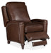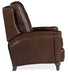 Curved arms, rounded posts and a shaped wing back trimmed in nailhead add distinction to the Rylea Manual Pushback Recliner Chair. The stylish manual recliner combines the Valencia aniline top grain leather in a soft brown color with dark wood spool feet.