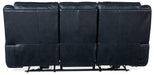 Chunky and comfy in the chic Cosmos Cobalt finished top-grain leather, the Montel Power Recline Sofa has it all: smooth reclining motion to the lay-flat position, a power headrest, adjustable lumbar support and a USB port. Tailoring details include a bustle-style back and decorative top stitching.