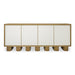 The Marcelle sideboard in black embodies minimalist elegance as playful, chunky legs enliven clean lines. Wire-brushed oak meets sleek black shagreen, framed by antique gold accents, creating a symphony of textures. Push-to-open doors reveal ample storage, while discreet media holes ensure seamless cable management.
