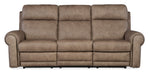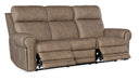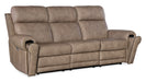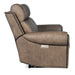 Plush and oh-so-inviting, the Duncan Power Sofa with power headrest and lumbar support is the ultimate in comfort. Featuring plush seat cushions and a bustle-style back, rolled arms and nailhead trim, it has a USB port and pop-out arm panel with a hidden metal cupholder. The two ends recline all the way back into the “zero-gravity” position, to give you a sensation of weightlessness with no pressure points. The sofa is upholstered in the semi-aniline top-train Kalahari Camel leather.