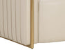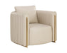 The Alix Lounge Chair is elevated comfort with a touch of glamour. A luxuriously rounded frame is upholstered in napa beige faux leather. Channeled piping and gold stainless steel detailing on the front and back add visual allure from every angle. Handle With Care: This design has been crafted with faux leather. Faux leather is manufactured to reflect the natural characteristics of leather; as such, colour variations, markings, wrinkles, grooves, and light scratches are appreciated characteristics. No two pieces will be alike. Visit our Product Care page for more information on how to ensure the lasting beauty of this piece.