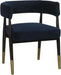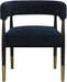 Invite guests to relax in this elegant open back armchair. Features a modern barrelback seat in antonio charcoal fabric with ruching on the exterior. An exposed brown birchwood frame with gold metal caps completes the look. Perfect for living, lounge and office spaces.