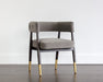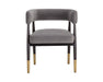 Invite guests to relax in this elegant open back armchair. Features a modern barrelback seat in antonio charcoal performance fabric with ruching on the exterior. An exposed brown birchwood frame with gold metal caps completes the look. Perfect for living, lounge and office spaces. Performance fabric is moisture repellent, durable and easy to clean.