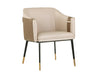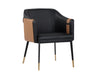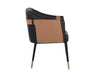 A unique barrel back dining armchair upholstered in supple napa black faux leather and accented with a contrasting exterior in napa cognac faux leather. Finished with black steel legs and copper foot caps. Also available in napa beige and a contrasting exterior in napa tan faux leather. Suitable for residential and commercial spaces. Handle With Care: This design has been crafted with faux leather. Faux leather is manufactured to reflect the natural characteristics of leather; as such, colour variations, markings wrinkles, grooves, and light scratches are appreciated characteristics. No two pieces will be alike. Visit our Product Care page for more information on how to ensure the lasting beauty of this piece.