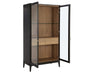 Acacia Veneer / Tempered Glass Doors / Powder Coated Door Frame / Max Loading Weight for Each Shelf: 45lbs / Solid Rubberwood Legs / Brass Handle