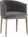Feminine flair comes to life in this modern dining chair. Stocked in our soft blush purple, blush grey and forest green fabric with elegant diamond stitching on the exterior seatback. An antique brass steel frame completes the look. Also available in polo club stone performance fabric