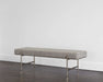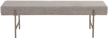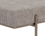 Defined by clean lines, this fabulous bench will effortlessly infuse modern style into any space. Stocked in chacha grey and limestone fabrics, and completed with an antique brass powder coated steel base.