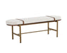 With a curved silhouette that features a rich mix of materials, this spectacular bench is a great addition to any space. Stocked in polo club muslin fabric with a walnut veener frame. Includes removable bravo cognac faux leather straps and completed with an antique brass steel base. Handle With Care: This design has been crafted with faux leather. Faux leather is manufactured to reflect the natural characteristics of leather; as such, colour variations, markings, wrinkles, grooves, and light scratches are appreciated characteristics. No two pieces will be alike. Visit our Product Care page for more information on how to ensure the lasting beauty of this piece.