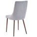 The clean-line design and clear tempered glass gives this table a modern, minimalist look, while the black finish lends an elegant flare. Large enough for four chairs to fit comfortably, yet small enough to work in the tightest spaces. Minimal assembly is required. Composed of wood, fabric, and metal, this chair is a show stopper all its own. With its curved wood seat frame, seat cushion covered in fabric upholstery, and metal legs emblazoned with a walnut finish through the process of heat transferring, this chair unifies a multitude of elements all into one perfectly composed design. The slim, tapered look of the metal legs have added appeal.