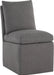 A formal and comfortable wheeled dining chair that is full of classic appeal. Stocked in effie linen and smoke fabrics. Also available in an armrest dining chair version.