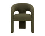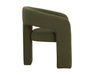 Clean lines and contoured arches add style and structure to this contemporary dining chair. Features a curved backrest and open back for optimal comfort. Eye-catching from all angles. Fully upholstered in copenhagen olive fabric.