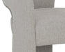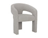 Clean lines and contoured arches add style and structure to this contemporary dining chair. Features a curved backrest and open back for optimal comfort. Eye-catching from all angles. Fully upholstered in our abbington back fabric. Lounge chair version in ernst sandstone fabric, meg teal and gold fabrics and copenhagen white fabric also available.