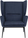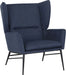 Elevate any space with this contemporary lounge chair that has a marvelous wingback design. Stocked in belfast navy fabrics with subtle horizontal tufting on the interior seat. Completed with matte black powder coated steel frame and legs.