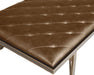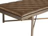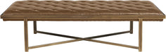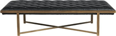 This large bench exudes opulent transitional style. Features diagonal tufting with an exposed x-base frame. Stocked in vintage black faux leather with an antique brass frame. Can be used as a daybed, coffee table or as extra seating in residential and commercial spaces. Handle With Care: This design has been crafted with faux leather. Faux leather is manufactured to reflect the natural characteristics of leather; as such, colour variations, markings, wrinkles, grooves, and light scratches are appreciated characteristics. No two pieces will be alike. Visit our Product Care page for more information on how to ensure the lasting beauty of this piece.