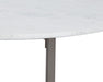 Boasting a minimalist design, this modern coffee table illustrates the contrasting beauty of smooth curves with rigid lines. Features a round, white marble top with a stainless steel gunmetal base. Also available in an oval version with coordinating console and end tables. As marble is a natural material, unique veining, pitting, fissures, micro-cracks and colour variations are all characteristics that add to the uniqueness and beauty of each piece.
