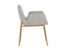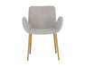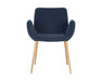 With its stunning scooped design, this modern dining armchair is an impressive addition to any dining space. Features vertical channel tufting on exterior seat. Stocked in belfast heather grey, navy and rust fabrics, and completed with gold stainless steel legs.
