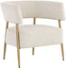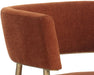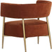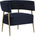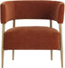 Turn heads with this contemporary lounge chair that exudes extravagance. Features a curved frame and upholstered in our danny navy and rust fabrics. Completed with antique brass legs. Also available in dove cream fabric.