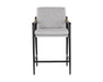Functional with a timeless design, this mid-century style counter stool offers a clean silhouette that will suit any space. Stocked in vault fog fabric with solid oak wood armrests. Completed with a black iron frame. Also available in a dining armchair and lounge chair version.