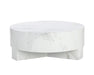 Infuse modern simplicity into any space with this alluring coffee table. Features a circular tabletop with a cutout base. Crafted from sealed concrete with a white Calacatta marble finish and its signature warm veining. Suitable for indoor and outdoor use. This marble finish can have unique veining, pitting, fissures, micro-cracks and colour variations that add to the uniqueness and beauty of each piece.