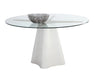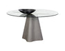 The beautiful structure of this modern dining table is guaranteed to make it the centre of attention at any dining room space. Features a clear tempered glass top with a grey concrete base and a centre support in an antique brass finish. Also available in white concrete. Crafted from a natural concrete mix, each piece will look different, with variations of grey hues that will enhance over time.