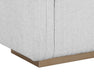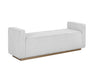 Boasting a chic block design, this modern bench features a minimalist design with high impact. Upholstered in ernst silverstone fabric with channel tufting. Completed with a striking antique brass stainless steel base. Also available in maven black faux leather.