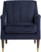This transitional armchair sits comfortably in lush abbington navy fabric. Designed with channel tufting on the seatback and sculpted arms. Tapered acacia wood legs with antique brass footcaps complete the look. Perfect for any living, lounge or office space.