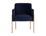 Invite guests to dine in style with this modern dining armchair. Designed with a comfortable seat in a softly textured danny navy fabric with exposed antique brass iron legs. Also available in danny amber fabric with black metal legs.