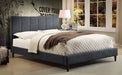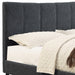 - Textured, linen-look polyester fabric with vertical panel stitching on headboard