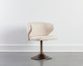 Create a captivating dining space with this eye-catching swivel dining chair that has a contemporary flair. Stocked in casablanca cloud performance fabric and completed with a round, antique brass stainless steel base. Also available in meg ash fabric. Performance fabric is moisture repellant, stain resistant and easy to clean.