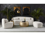 Boasting a design that is all about that curve appeal, this marvelous swivel armless chair will add shape to any space. Stocked in dove cream fabric and completed with a wooden frame. Coordinating sofa and ottoman also available.