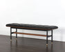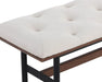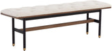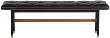 Sophisticated and timeless, this mid-century modern bench includes beautiful button tufting on the seat. Stocked in black faux leather and paired with a black steel base. Features an accenting solid walnut timber frame and beam on the base. Brass metal caps complete the look. Also available in vienna cream fabric. Handle With Care: This design has been crafted with faux leather. Faux leather is manufactured to reflect the natural characteristics of leather; as such, colour variations, markings, wrinkles, grooves, and light scratches are appreciated characteristics. No two pieces will be alike. Visit our Product Care page for more information on how to ensure the lasting beauty of this piece.